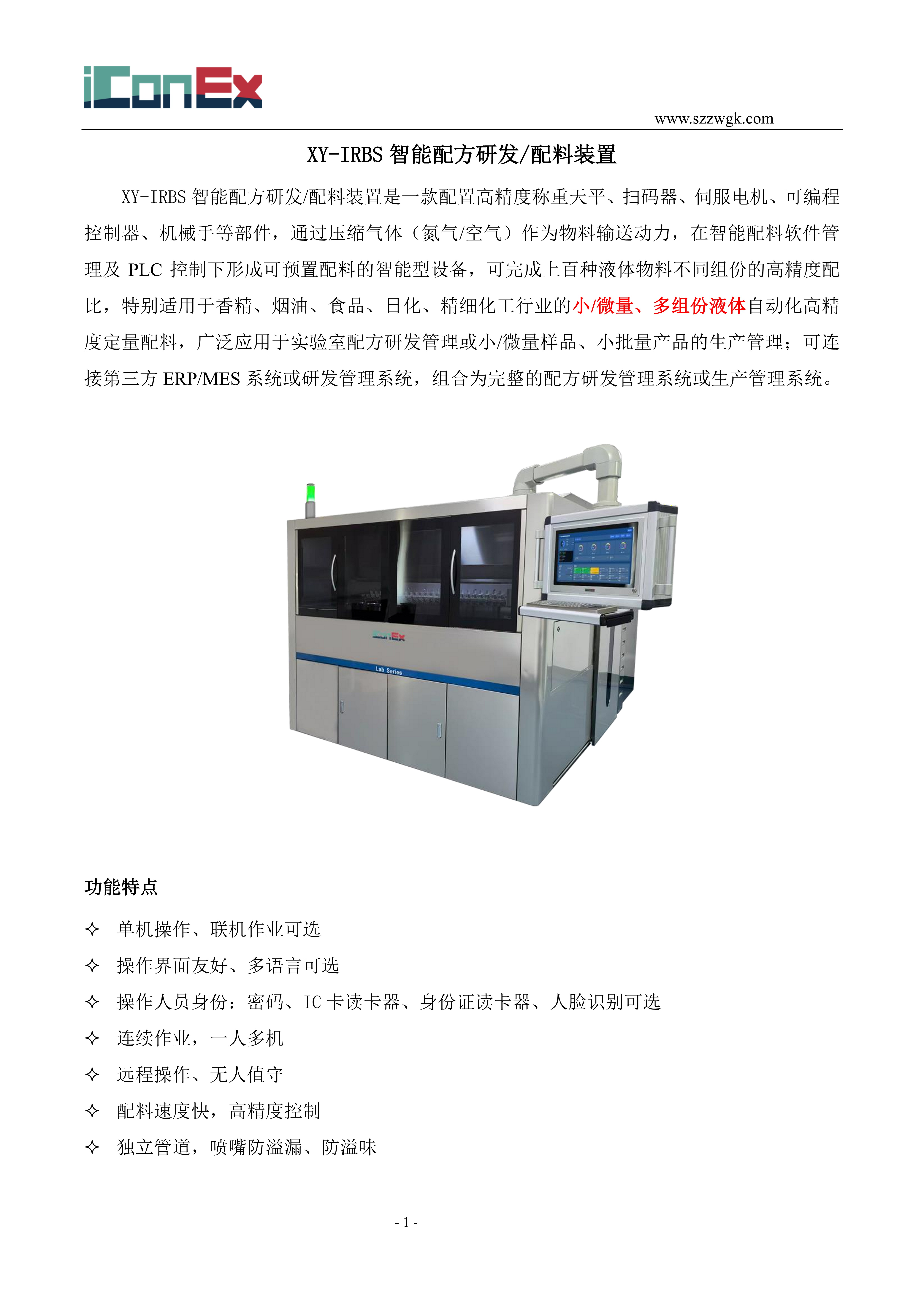 XY-IRBS 智能配方研发/配料装置是一款配置高精度称重天平、扫码器、伺服电机、可编程 控制器、机械手等部件,通过压缩气体(氮气/空气)作为物料输送动力,在智能配料软件管 理及 PLC 控制下形成可预置配料的智能型设备,可完成上百种液体物料不同组份的高精度配 比,特别适用于香精、烟油、食品、日化、精细化工行业的 小/微量、多组份液体自动化高精 度定量配料,广泛应用于实验室配方研发管理或小 /微量样品、小批量产品的生产管理;可连 接第三方 ERP/MES 系统或研发管理系统,组合为完整的配方研发管理系统或生产管理系统。XY-IRBS 智能配方研发/配料装置是一款以工业平板电脑和 PLC 为控制系统的智能设备, 集成称重天平/台秤、扫码器、运动控制、伺服电机及打印机等设备,通过压缩气体(氮气/空 气)作为输送动力,形成可预置高精度精密配料设备;通过安装配方管理软件,可用于实验室 配方研发管理;连接第三方 ERP/MES 系统,可按照配方要求实现多达上百种液体物料的高精 度定量配比、条码输出等功能,特别适用于香精香料、各类化工助剂配方研发以及日化、精细 化工行业的小/微量、多组份液体自动高精度定量配料。